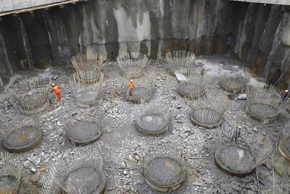 8月24日,繼龍巖大道高架橋主橋主塔樁基、承臺(tái)基坑開(kāi)挖完成后,項(xiàng)目已進(jìn)入主塔承臺(tái)施工階段,主橋封底混凝土澆筑完成0.75米(共1.5米)主橋轉(zhuǎn)體關(guān)鍵設(shè)備鑄鋼球鉸已生產(chǎn)完成,現(xiàn)場(chǎng)正進(jìn)行樁頭破除作業(yè)。由于連續(xù)橫跨贛龍鐵路、龍廈鐵路、羅龍東路、龍津河、雙洋路,主橋采用不對(duì)稱跨塔梁同時(shí)轉(zhuǎn)體施工,其轉(zhuǎn)體總重達(dá)2.366萬(wàn)噸,轉(zhuǎn)體懸臂173.75m,施工難度巨大。為避免對(duì)城市道路及鐵路運(yùn)行的影響,主橋?qū)⒉捎貌粚?duì)稱跨塔梁施工并分二次轉(zhuǎn)體,下一步進(jìn)行控制性工程為兩次主塔轉(zhuǎn)體施工。